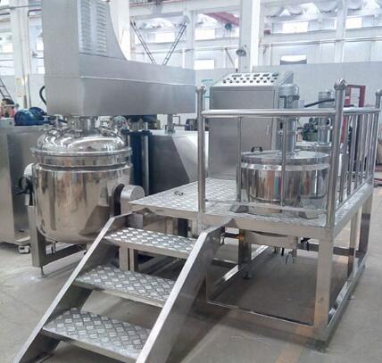 物料首先在高剪切真空均质乳化机中预热、拌和,再经过运送管道可在剪切状态下直接吸入设备内部。物料在高剪切真空均质乳化机中经过锅内拌和上的聚四氟乙烯刮板,不断发生新界面,再经过框式拌和器及与其反向拌和叶的剪断紧缩、折叠,使其拌和、混合而向下流往真空乳化机体下方的均质器处,然后经过高速旋转的转子与定子之间所发生的强力的剪断冲击、乱流等过程使物料在剪切缝中被切割,迅速破碎成200nm~2μm的微粒。