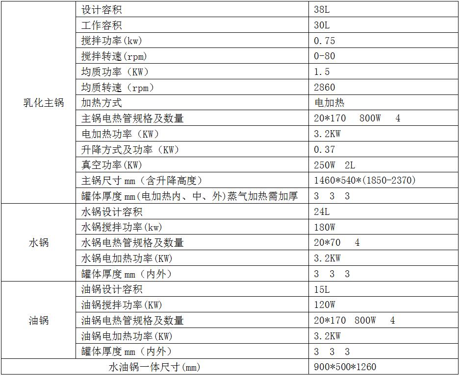 ①打开电源→②油水锅加料→③油水锅合盖→④油水锅加热搅拌→⑤均质锅合盖、关闭盖上其他阀门,打开抽真空阀门进行抽真空(吸料)→⑥均质锅加热(温度可调)→⑦均质搅拌乳化贯差物料(时间到)停止加温→⑧再打开放料阀放料→⑨(清洗后可升起锅盖倾倒排污再合盖)→⑩ 循环前面的工作。