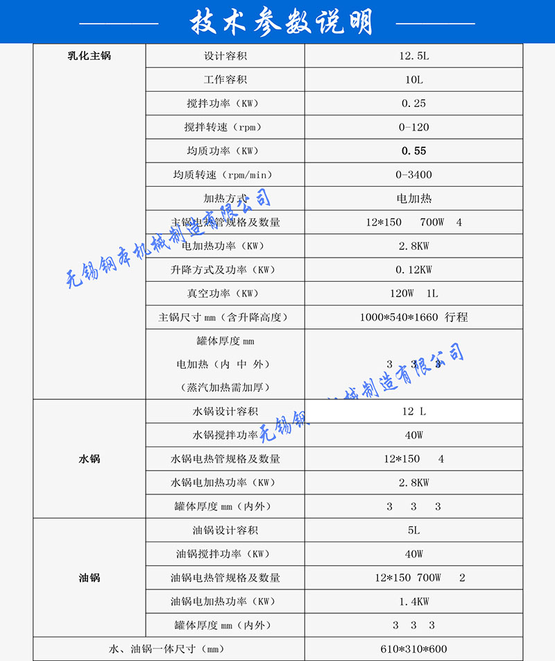 该系列设备具有独特可视装置,玻璃板下有洁刮板,配有封闭式照明,供操作员工随时观察物料的乳化情况。乳化锅的加热采用夹套电加热,合理的夹套冷却,外层隔热,以防员工烫伤,确保生产安全。