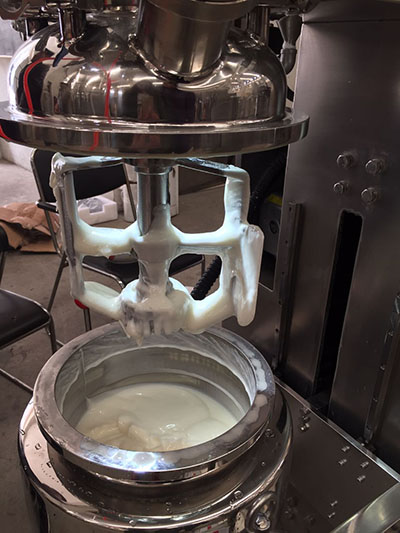 物料在水锅、油锅内通过加热、搅拌进行混合反应后,由真空泵吸入乳化锅,通过乳化锅内上部的中心搅拌、聚四氟乙烯刮板始终迎合搅拌锅形体,扫净挂壁粘料,使被刮取的物料不断产生新界面,再经过叶片的剪断、压缩、折叠,使其搅拌、混合流往均质器处,物料再通过高速旋转的切割轮与固定的切割套之间所产生的强力的剪断、冲击、乱流等过程,物料在剪切缝中被切割,迅速破碎成200um-0.2um的微粒,由于乳化锅内处于真空状态,物料在搅拌过程中产生的气泡被及时抽走。采用抽真空的方式,使所生产的制品在搅拌过程中不再混入气泡,从而保证可制造出富有光泽、细腻及延展性良好的优质产品。