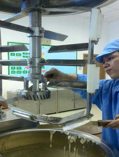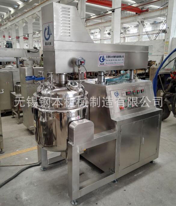 物料在水锅、油锅内通过加热、搅拌进行混合反应后,由真空泵吸入乳化锅,通过乳化锅内上部的中心搅拌、聚四氟乙烯刮板始终迎合搅拌锅形体,扫净挂壁粘料,使被刮取的物料不断产生新界面,再经过叶片的剪断、压缩、折叠,使其搅拌、混合流往均质器处,物料再通过高速旋转的切割轮与固定的切割套之间所产生的强力的剪断、冲击、乱流等过程,物料在剪切缝中被切割,迅速破碎成200um-0.2um的微粒,由于乳化锅内处于真空状态,物料在搅拌过程中产生的气泡被及时抽走。采用抽真空的方式,使所生产的制品在搅拌过程中不再混入气泡,从而保证可制造出富有光泽、细腻及延展性良好的优质产品。