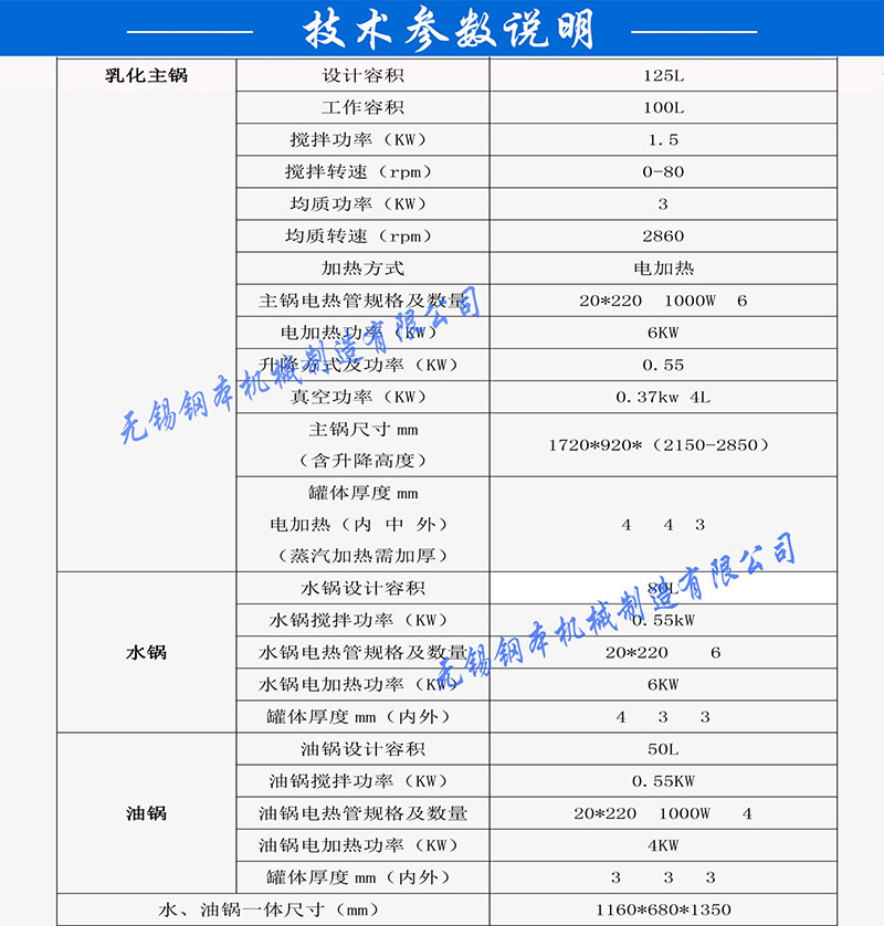 加热系统:电动升降系统:电压380V、功率2.4KW,控制系统:控制系统配有数码时间继电装置,可有效控制均值时间。本机所有动力开、关温度显示、控制、均质机时间设定都合理集中在一起.操作起来一目了然。