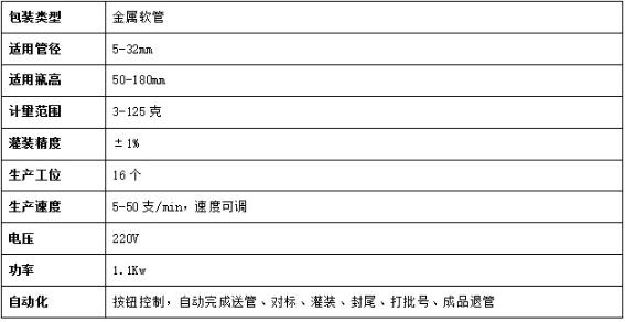全自动金属软管灌装封尾机主要利用分度机构带动装有夹具的转盘作间歇运动,完成自动送管、对标、灌装、封尾、压码、成品退出等一系列功能。灌装计量准确,灌装速度可调,封尾外观漂亮、整齐、牢固、卫生。该机设有16个工位,自动完成,整机运行平稳可靠。接触物料部分及某些相关部位均采用优质不锈钢制作,需要清洗的部位均选用快换装置,拆洗方便。该机适用于铝管等金属软管作为包装材料的物料,是化妆品、制药、胶粘剂、鞋油等行业的产品。