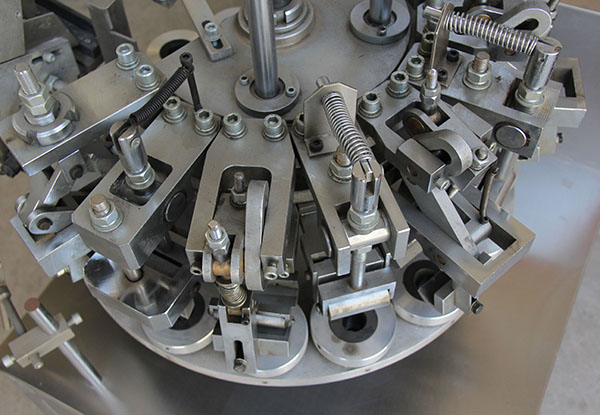 人工将塑料瓶插入分度盘管座内(16个工位),利用机械传动自动转位,光电检测,确认有管开始自动计量灌入管内、然后通过电磁震动盘进行上盖,专用电机旋盖,能确保盖子旋固到位。该机采用无级调速,光电控制,做到有瓶就灌,无瓶不灌。适用一般液体和瞬间胶的灌装与旋盖。