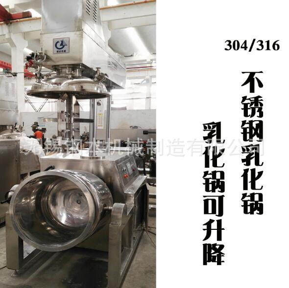 锅盖可升降,倾倒出料,也可锅底放料,清洗方便。通过电热管对锅夹层内的导热介质进行加热来实现对物料的加热,加热温度任意设定,自动控制,均质搅拌分别具有时间设定功能操作方便。在夹层内接入冷却液即可对物料进行冷却,操作简单、方便,夹层外设有保温层。均质系统和搅拌系统可分开使用,也可同时使用。物料的微粒化可达到200um-2um 、乳化、混合、调匀、分散等可于短时间内完成。与物料接触部分采用优质不锈钢 医用316L或者304,内表面镜面抛光,真空搅拌装置卫生清洁,采用符合GMP规范的卫生标准制造,是客户理想的膏霜生产设备。