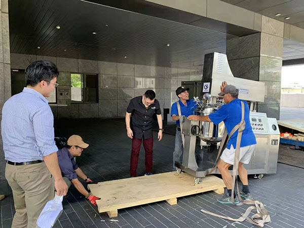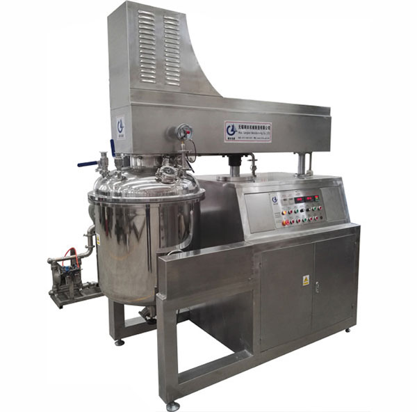 物料在水锅、油锅内通过加热、搅拌进行混合反应后,由真空泵吸入乳化锅,通过乳化锅内上部的中心搅拌、聚四氟乙烯刮板始终迎合搅拌锅形体,扫净挂壁粘料,使被刮取的物料不断产生新界面,再经过叶片的剪断、压缩、折叠,使其搅拌、混合流往均质器处,物料再通过高速旋转的切割轮与固定的切割套之间所产生的强力的剪断、冲击、乱流等过程,物料在剪切缝中被切割,迅速破碎成200um-0.2um的微粒,由于乳化锅内处于真空状态,物料在搅拌过程中产生的气泡被及时抽走。采用抽真空的方式,使所生产的制品在搅拌过程中不再混入气泡,从而保证可制造出富有光泽、细腻及延展性良好的优质产品。
