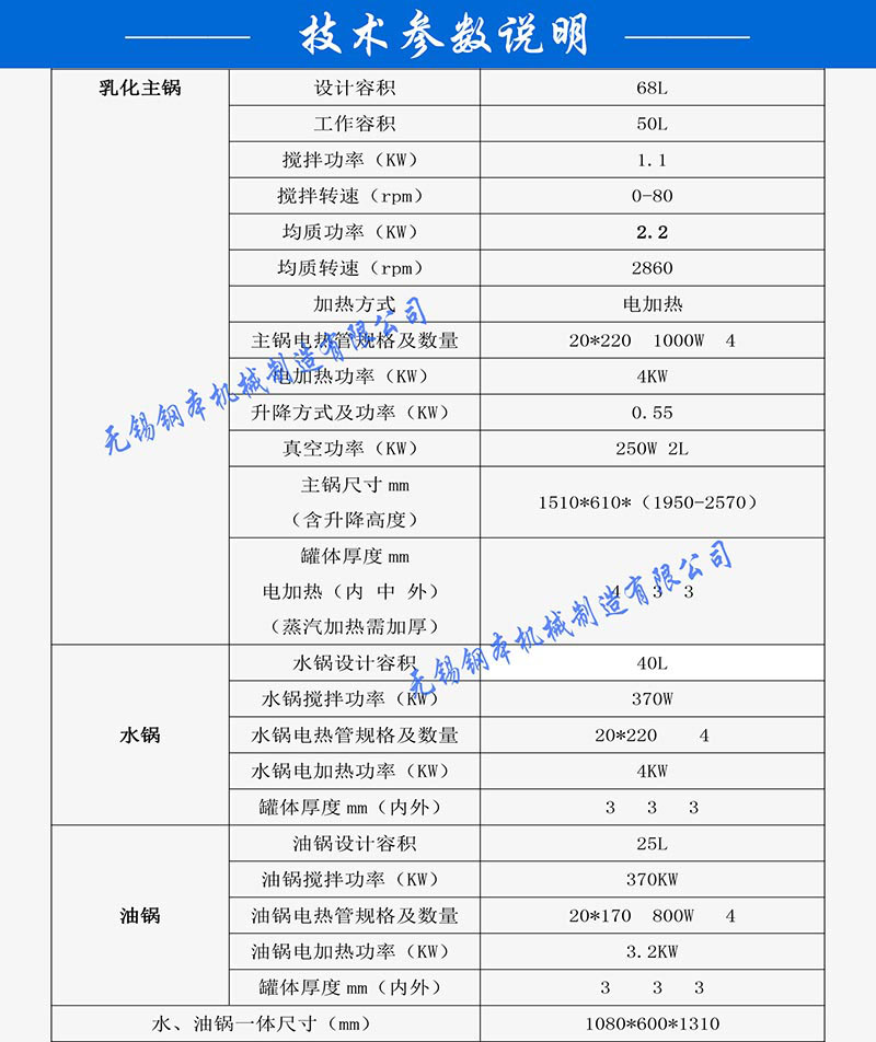 1.具有独特可视装置,玻璃板下有洁刮板,配有封闭式照明,供操作员工随时观察物料的乳化情况。乳化锅的加热采用夹套电加热,合理的夹套冷却,外层隔热,以防员工烫伤,确保生产安全。
