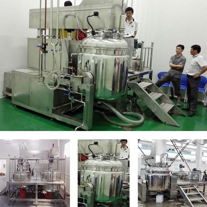 物料在水锅、油锅内通过加热、搅拌进行混合反应后,由真空泵吸入乳化锅,通过乳化锅内上部的中心搅拌、聚四氟乙烯刮板始终迎合搅拌锅形体,扫净挂壁粘料,使被刮取的物料不断产生新界面,再经过叶片的剪断、压缩、折叠,使其搅拌、混合而向下流往锅体下方的均质器处,物料再通过高速旋转的切割轮与固定的切割套之间所产生的强力的剪断、冲击、乱流等过程,物料在剪切缝中被切割,迅速破碎成200um-0.2um的微粒,由于乳化锅内处于真空状态,物料在搅拌过程中产生的气泡被及时抽走。采用抽真空的方式,使所生产的制品在搅拌过程中不再混入气泡,从而保证可制造出富有光泽、细腻及延展性良好的优质产品。